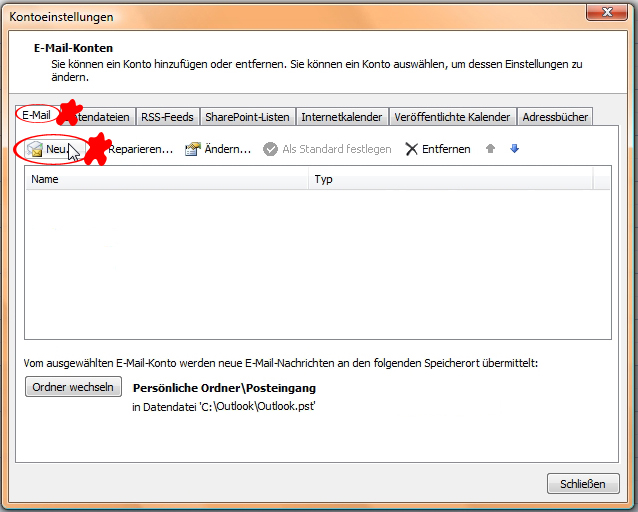 Um ein E-Mail-Konto einzurichten klickt man oben auf Extras und wählt dann Kontoeinstellungen aus.
