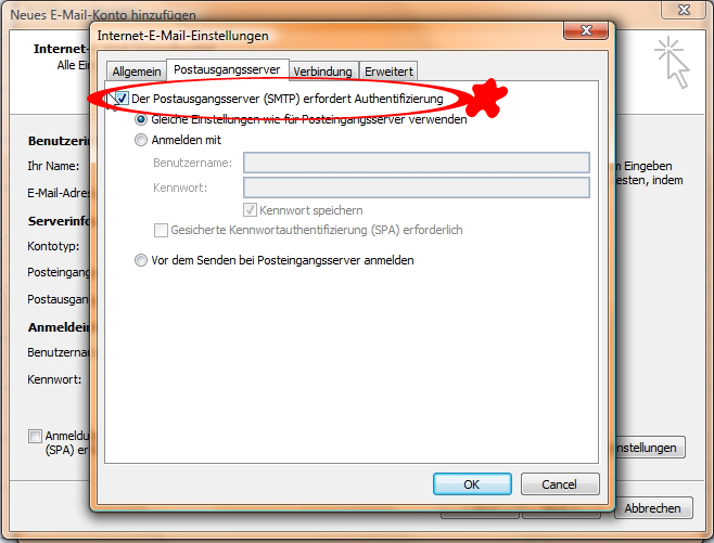 Hier muss man jetzt oben den Reiter Postausgangsserver auswählen und ein Häckchen bei Der Postausgangsserver(SMTP) erforder Authentifizierung setzen.